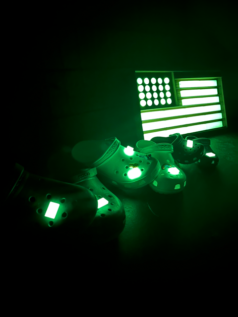 You can easily add them to Crocs shoes to accessorize and create a unique look for showing off your Patriotism by day, and your glow swag by night. Simply charge them up with a light source in seconds (sun=best, LED=second, high lumen flashlights=third), and they glow in the dark for hours visible to the naked eye.